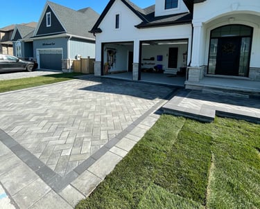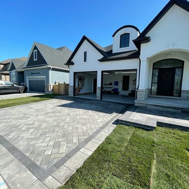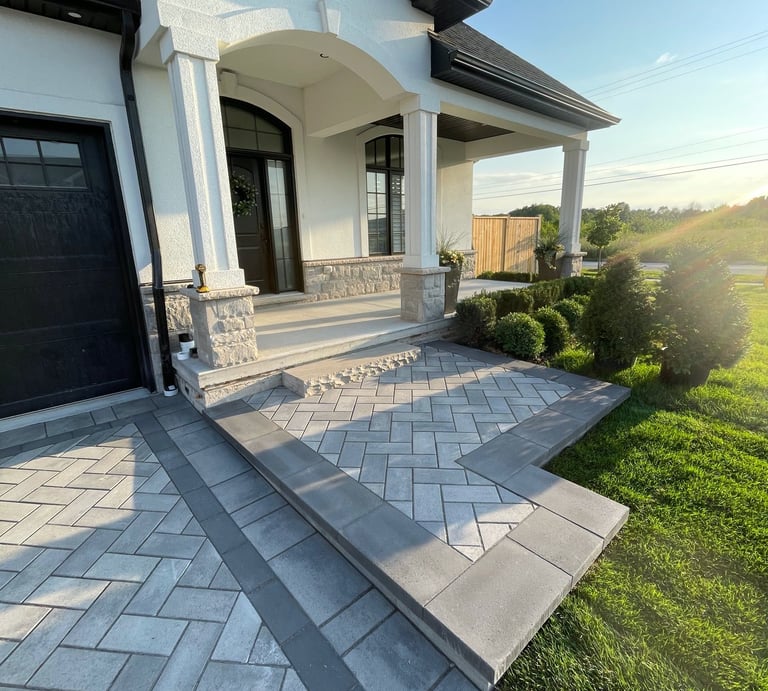 The grand entrance was designed to match the 45-degree herringbone driveway, creating a smooth and cohesive look from the street to the front door. Using the same pavers and layout, we carried the pattern through to tie everything together. The result is an entrance that feels connected to the rest of the space, welcoming guests with a clean, polished look that adds to the home's overall curb appeal.